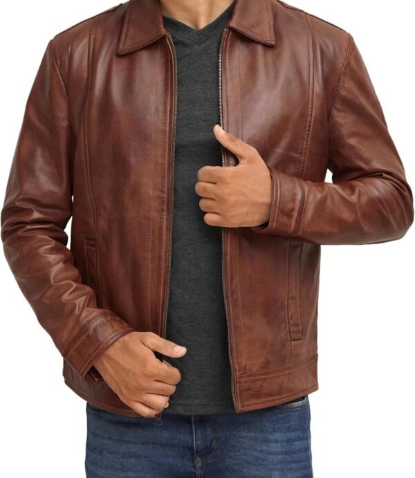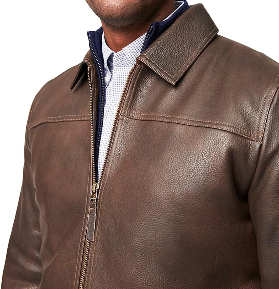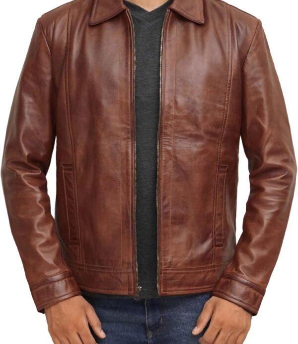 - This classic leather jacket for men usually features a simple, minimalist design, with a front zipper closure, a shirt-style collar, and two front pockets and two inner pockets. The brown color is a popular choice as it is sleek, sophisticated, and can match well with most outfits. mens brown learher jacket.